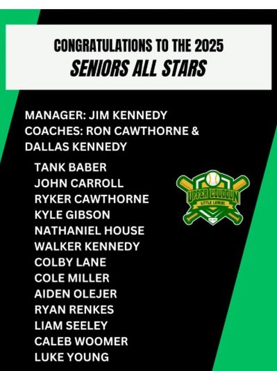 ULLL District All Star teams represent specific age groups of players that compete in the official LL International All Stars Tournament coordinated and run by Virginia District 16. District All Stars are selected through a lengthy process that includes nominations by the Managers the player pitch divisions (specifically the Majors, AAA, and AA) in each respective league (AL and NL)–with the final roster selected by committees for each league (AL and NL) composed of the ULLL’s Majors Managers, the ULLL Player Agent, ULLL President and the respective All Star Team Managers in late May.